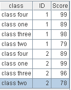 =A4.record(["class four",1,99,"class one",1,89, "class three",1,98,"class two",1,79, "class four",2,89, "class one",2,99,"class three",2,96,"class two",2,78]) |