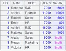 =A1.joinx@o(F1;EID,A2:EMPLOYEEID,~:SALARY1;5) |