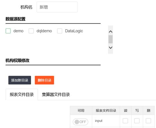 对机构设置数据源配置和目录权限配置主要用于设计器中远程服务时对数据源和文件目录的读取。远程服务的使用可参考远程上传报表小节。