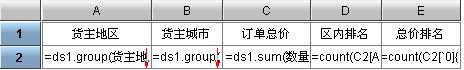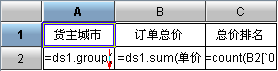 在该报表中C2格的内容为:=count(B2[`0]{B2>$B2})+1,该表达式是统计所有订单总价大于当前单元格订单总价的城市个数,然后加一,从而实现对订单总价排名的效果。